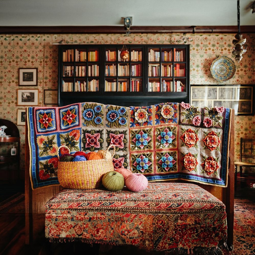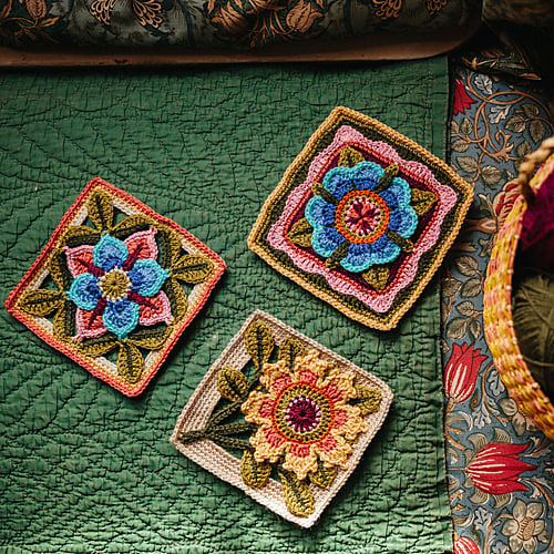 The Spirit of Flora blanket is made from twelve crochet motifs, each of which need to be made four times to create a blanket that uses a total of forty-eight pieces.